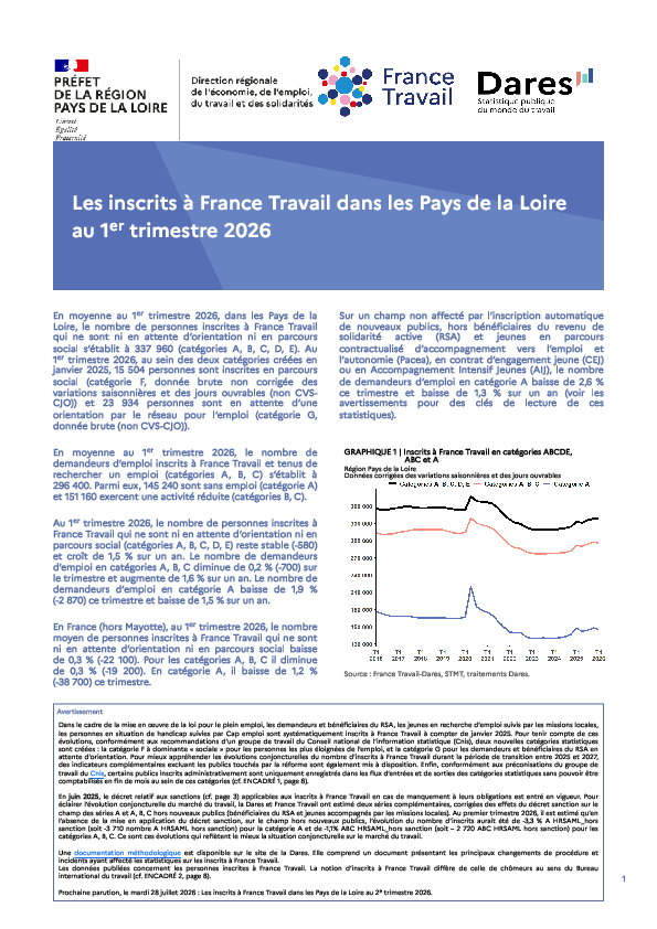 Retrouvez le nombre de demandeurs d’emploi inscrits à Pôle emploi en Pays de la Loire au première trimestre 2024 (Données STMT : STatistiques du Marché du Travail).