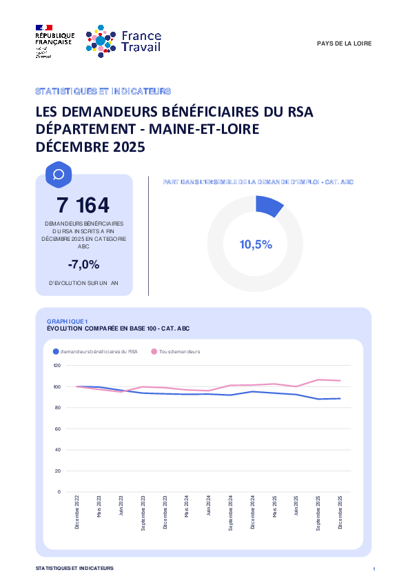 7 164 demandeurs bénéficiaires du RSA inscrits à France Travail en Maine-et-Loire à fin Décembre 2025 en catégorie ABC. Cela représente une évolution annuelle de -7,0%