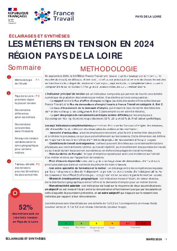 Analyse des tensions sur le marché du travail en Pays de la Loire sur l'année 2024 qui permet d'une part de classer les métiers en fonction de leur degré de tension à l'aide d'un indicateur principal et d’autre part de comprendre le ou les facteurs à l’origine d’une éventuelle tension détectée sur un métier donné grâce à 7 indicateurs complémentaires.