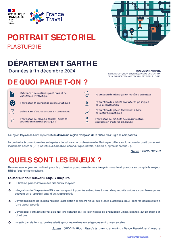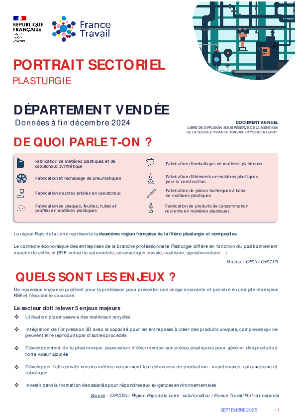 Les 303 établissements de la région intervenant dans la plasturgie emploient plus de 16 400 salariés à fin 2024. Le secteur représente 1,4% de l'emploi régional.Plus de 2 500 embauches (hors intérim) sont enregistrées en 2024, soit une moyenne mensuelle de 212. Avec 0,2% des embauches régionales, les établissements de la plasturgie ne sont pas les plus actifs en lien avec des durées de contrats de travail plus long.Plus de 300 demandeurs d'emploi recherchent un métier de la plasturgie fin 2024, soit 0,1% de la demande d'emploi régionale.