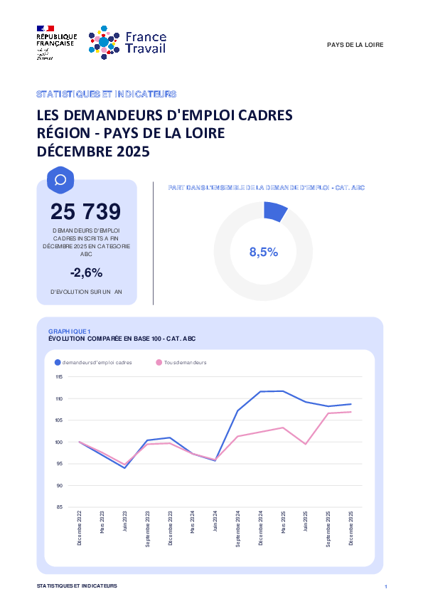25 739 demandeurs d'emploi cadres inscrits à France Travail en Pays de la Loire à fin Décembre 2025 en catégorie ABC. Cela représente une évolution annuelle de -2,6%