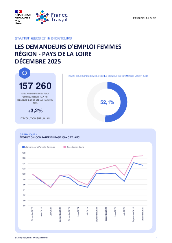 157 260 demandeurs d'emploi femmes inscrits à France Travail en Pays de la Loire à fin Décembre 2025 en catégorie ABC. Cela représente une évolution annuelle de +3,2%