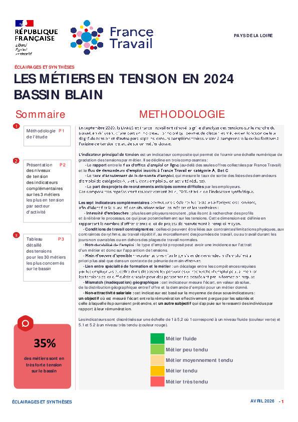Analyse des tensions sur le marché du travail au niveau du bassin d'emploi sur l'année 2024, qui permet d'une part, de classer les métiers en fonction de leur degré de tension à l'aide d'un indicateur principal, et d’autre part, de comprendre le ou les facteurs à l’origine d’une éventuelle tension détectée sur un métier donné grâce à 7 indicateurs complémentaires.