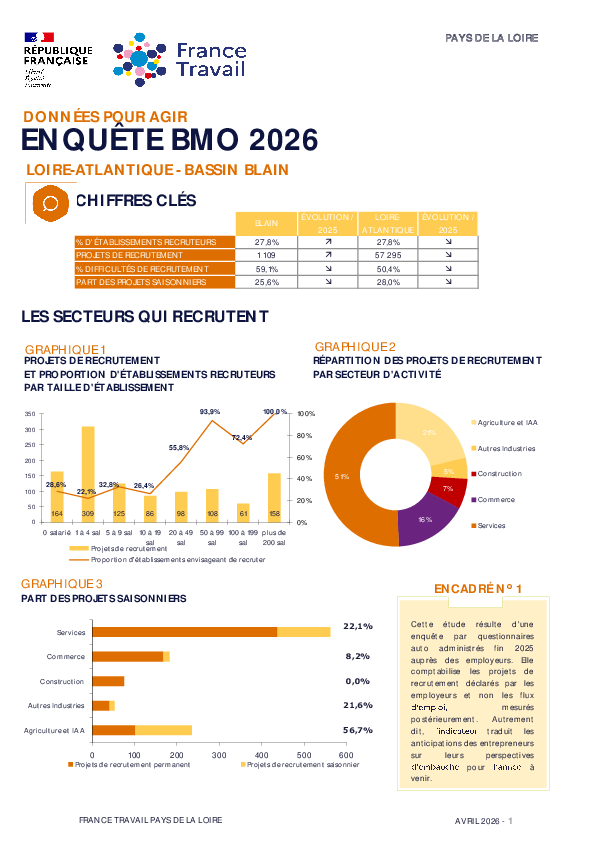 En novembre 2025, près de 94 700 établissements ont été interrogés sur leurs intentions d’embauche concernant l’année 2026. L’analyse des 23 900 réponses permet de recenser les métiers les plus recherchés, ainsi que les principales difficultés de recrutement rencontrées par les employeurs de la région. Grâce au nombre important de répondants, ces analyses peuvent également être conduites sur les cinq départements de la région et leurs vingt-six bassins d’emploi.