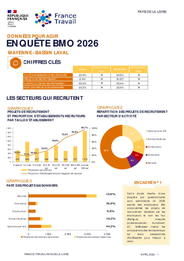 En novembre 2025, près de 94 700 établissements ont été interrogés sur leurs intentions d’embauche concernant l’année 2026. L’analyse des 23 900 réponses permet de recenser les métiers les plus recherchés, ainsi que les principales difficultés de recrutement rencontrées par les employeurs de la région. Grâce au nombre important de répondants, ces analyses peuvent également être conduites sur les cinq départements de la région et leurs vingt-six bassins d’emploi.