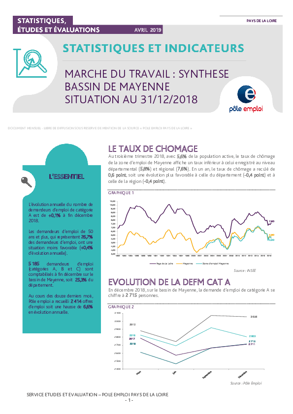 L’évolution annuelle du nombre de demandeurs d’emploi de catégorie A est de +0,1% à fin décembre 2018.Les demandeurs d’emploi de 50 ans et plus, qui représentent 26,7% des demandeurs d’emploi, ont une situation moins favorable (+0,4% d’évolution annuelle).5 185 demandeurs d’emploi (catégories A, B et C) sont comptabilisés à fin décembre sur le bassin de Mayenne, soit 25,3% du département.Au cours des douze derniers mois, Pôle emploi a recueilli 2 414 offres d’emploi soit une hausse de 6,6% en évolution annuelle.