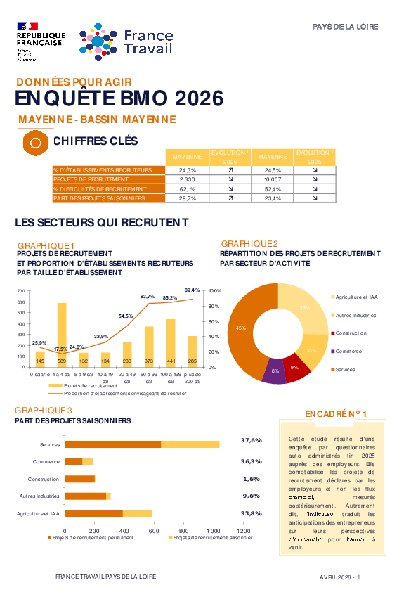 En novembre 2025, près de 94 700 établissements ont été interrogés sur leurs intentions d’embauche concernant l’année 2026. L’analyse des 23 900 réponses permet de recenser les métiers les plus recherchés, ainsi que les principales difficultés de recrutement rencontrées par les employeurs de la région. Grâce au nombre important de répondants, ces analyses peuvent également être conduites sur les cinq départements de la région et leurs vingt-six bassins d’emploi.