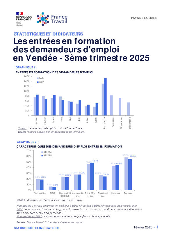 Au 3ème trimestre 2025, 2 464entrées en formation de demandeurs d'emploi inscrits à France Travail ont été décomptées en Vendée