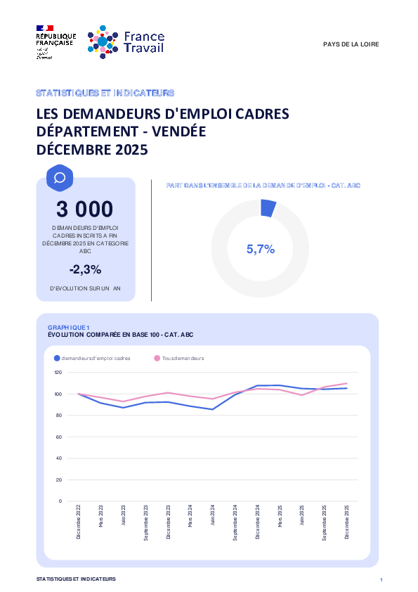 3 000 demandeurs d'emploi cadres inscrits à France Travail en Vendée à fin Décembre 2025 en catégorie ABC. Cela représente une évolution annuelle de -2,3%