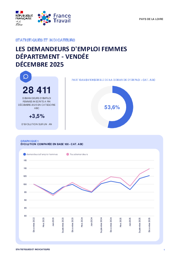 28 411 demandeurs d'emploi femmes inscrits à France Travail en Vendée à fin Décembre 2025 en catégorie ABC. Cela représente une évolution annuelle de +3,5%