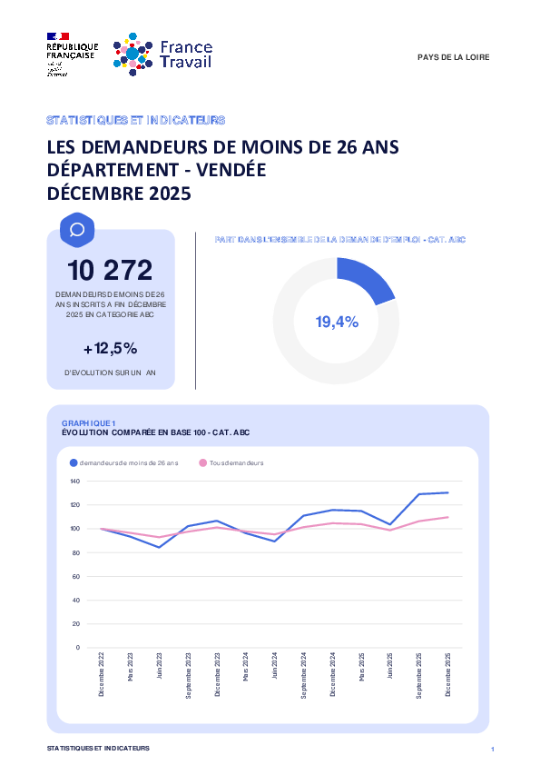 10 272 demandeurs de moins de 26 ans inscrits à France Travail en Vendée à fin Décembre 2025 en catégorie ABC. Cela représente une évolution annuelle de +12,5%