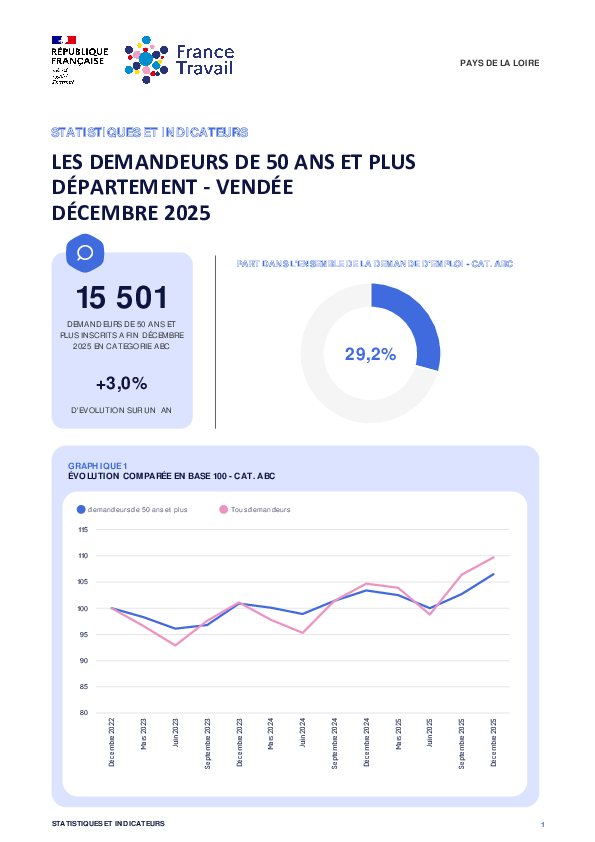 15 501 demandeurs de 50 ans et plus inscrits à France Travail en Vendée à fin Décembre 2025 en catégorie ABC. Cela représente une évolution annuelle de +3,0%