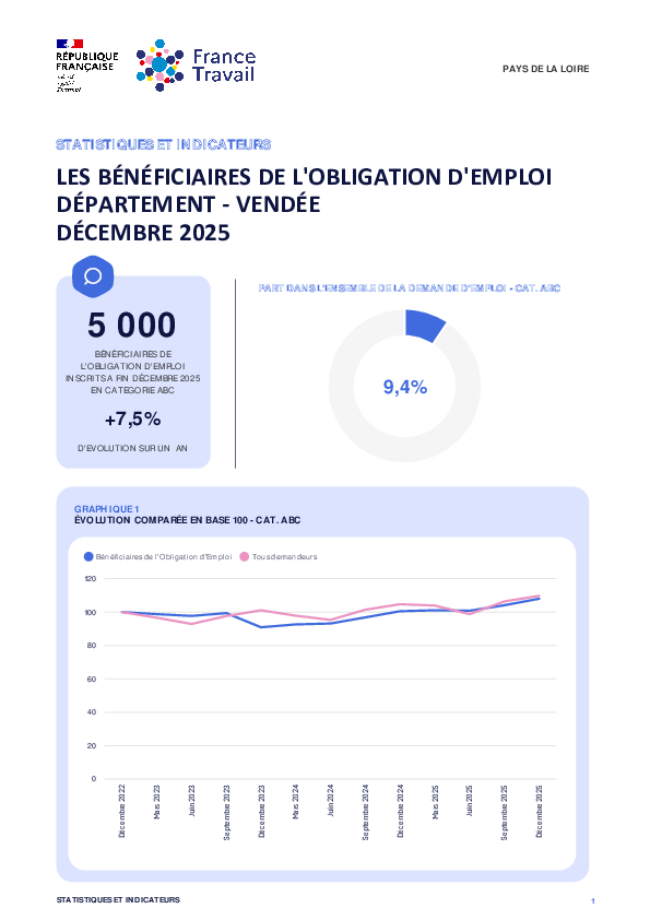 5 000 Bénéficiaires de l'Obligation d'Emploi inscrits à France Travail en Vendée à fin Décembre 2025 en catégorie ABC. Cela représente une évolution annuelle de +7,5%