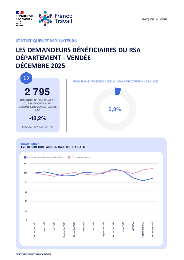 2 795 demandeurs bénéficiaires du RSA inscrits à France Travail en Vendée à fin Décembre 2025 en catégorie ABC. Cela représente une évolution annuelle de -18,2%