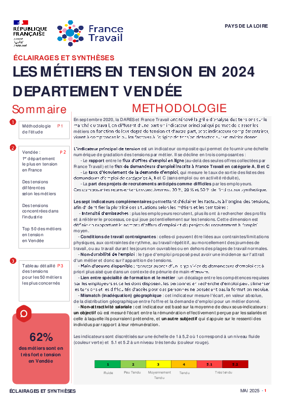 Analyse des tensions sur le marché du travail en Vendée sur l'année 2024 qui permet d'une part de classer les métiers en fonction de leur degré de tension à l'aide d'un indicateur principal et d’autre part de comprendre le ou les facteurs à l’origine d’une éventuelle tension détectée sur un métier donné grâce à 7 indicateurs complémentaires.