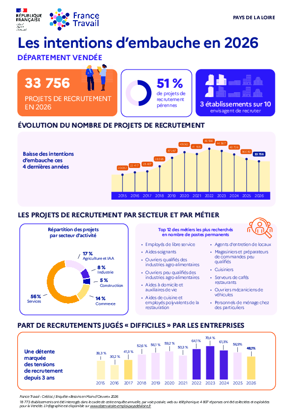 En novembre 2025, près de 18 800 établissements ont été interrogés sur leurs intentions d’embauche pour l’année 2026. L’analyse des 4 800 réponses permet de recenser les métiers les plus recherchés, ainsi que les principales difficultés de recrutement rencontrées par les employeurs et les projets de recrutement saisonniers du département.
